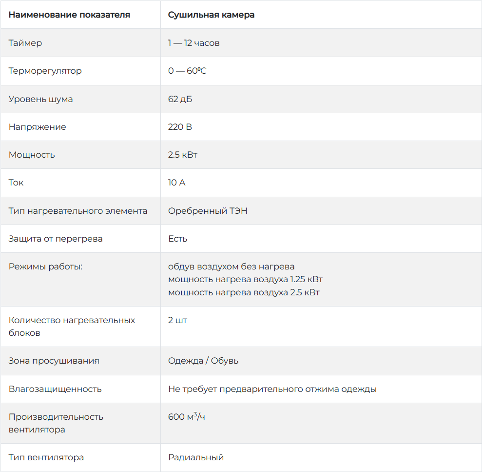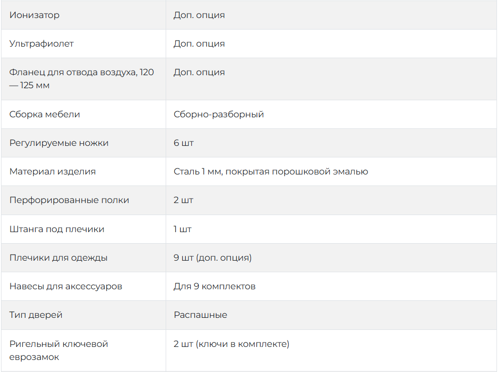 Данная модель сушильного шкафа предназначена для сушки девяти комплектов (что включает в себя: 9 комплектов одежды, 9 пар обуви, 9 пар перчаток), шкаф надежно закрывается ключом.