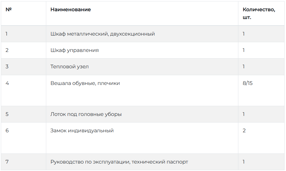 Сушильная камера разделена на обувной и вещевой шкафы, оборудованные лотком для головных уборов и вешалками для одежды и обуви. Шкафы закрываются на ключ.