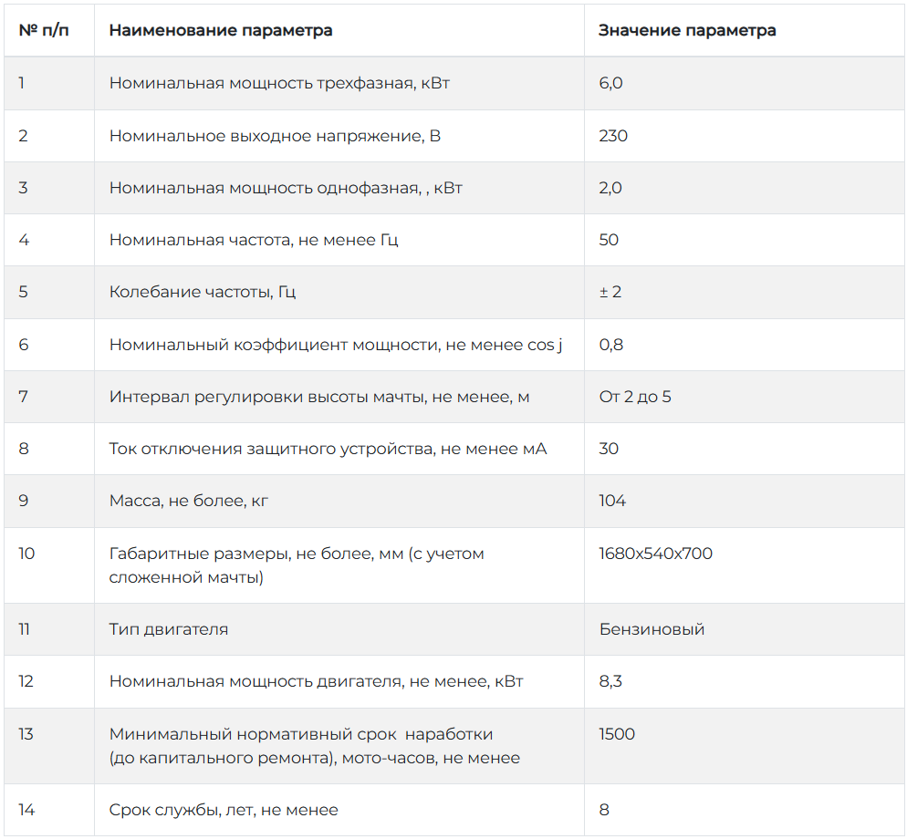 Оборудование состоит из Электроагрегата, закреплённой на его раме телескопической мачты с механизмом подъёма и быстро устанавливаемого светильника, и соответствует ГОСТ Р 15.301-2016 «Система разработки и постановки продукции на производство..