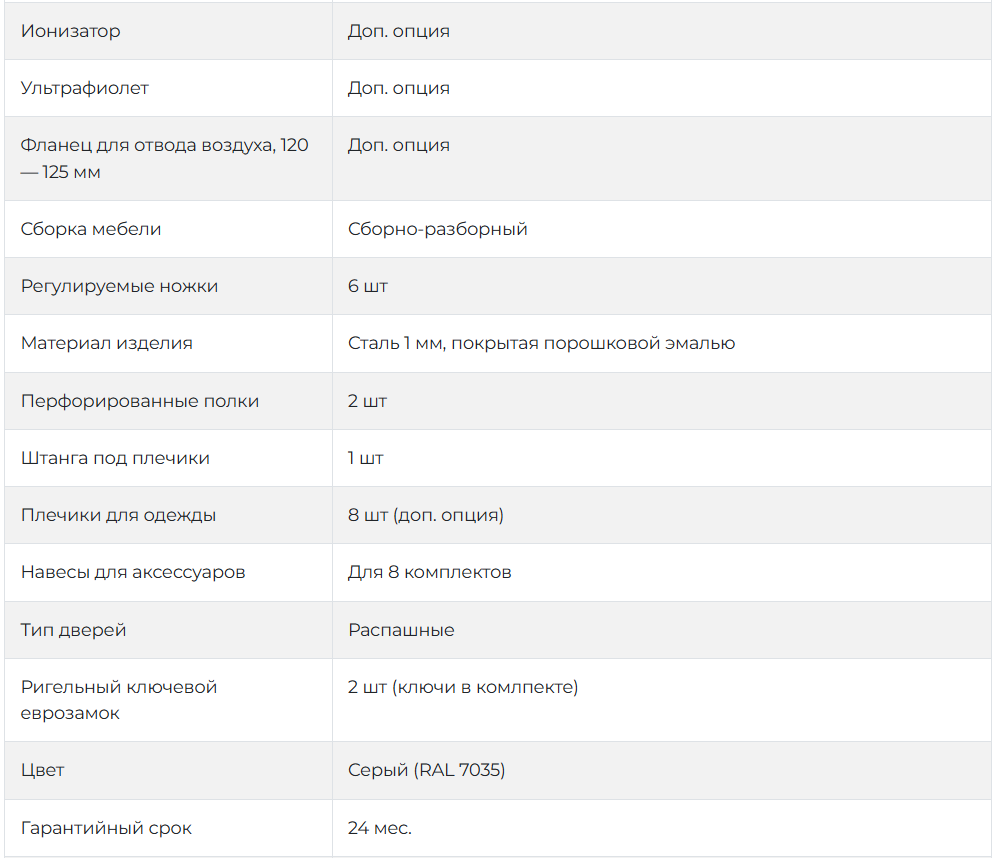 Данная модель сушильного шкафа предназначена для сушки восьми комплектов одежды, спецодежды (что включает в себя: 8 комплектов одежды, 8 пар обуви, 8 пар перчаток), шкаф надежно закрывается ключом.